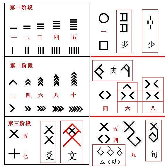 数字“一~九”,一二三四五,积画,四方、交午,纵横,都好理解,YY推测“六七八九”也有失传可以臆想的说法 :六七八九对应 ^ ﹢ ║ ├