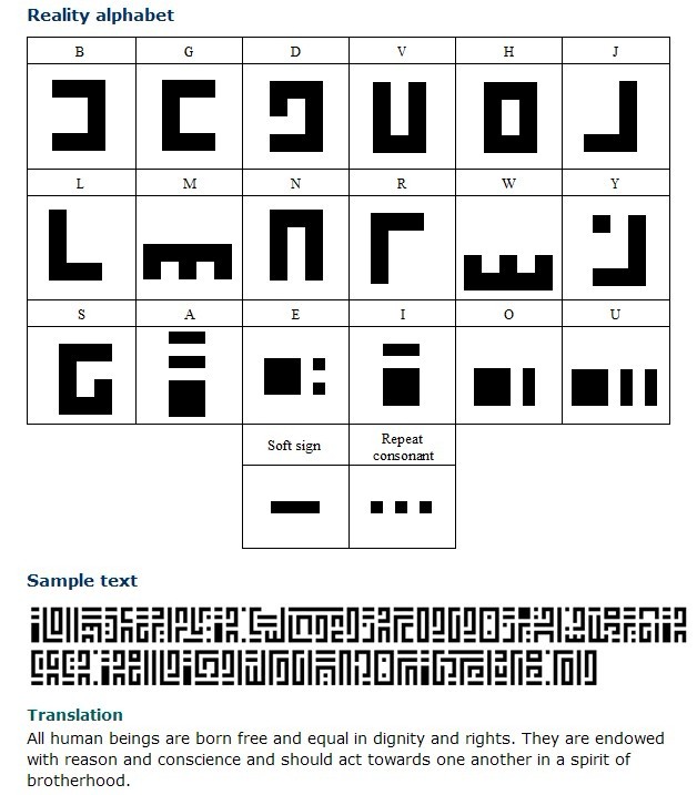 :cool: http://omniglot.com/writing/reality.php The Reality alphabet, which was invented by Michael Gibson, is a simple alphabetic script designed to mimic the aesthetics of the glyphs seen in the Blade movie franchise. It was designed mainly for writing single words or short phrases for decorative purposes.