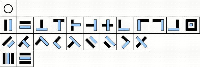 受到金岷前辈的启发,第二套拓扑员可以改为下图所示,其中第四行专门表示如上中下,左中右结构的字形。仍然是二元输入,所不同的是,上下和左右两部分作为一个物理上分离、逻辑上连接的整体。