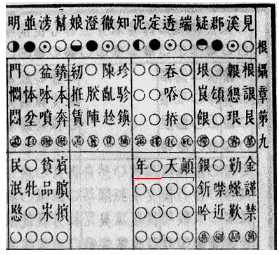 在《康熙字典》上,有诸多en—an混读方音特征历史存在的确切例证。首先,在字典正文前面的《明显四声等韵图》上,就有很典型的例子。笔者在解读这个等韵图时发现,在本应只含有en韵字的根摄章,却掺杂着本属an韵字的“年、天、颠”三字(见文末图片)。韵图的这种编排,是作者en—an混读方音习惯的必然反映。