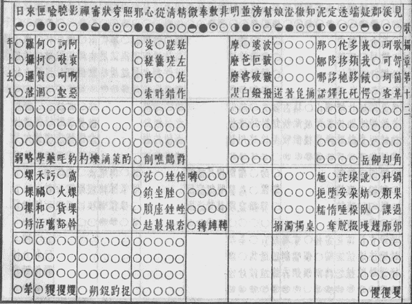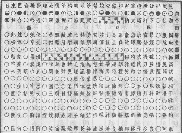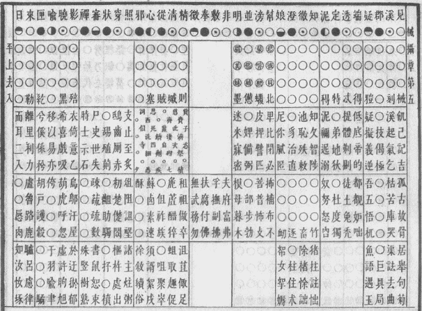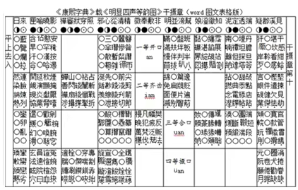《明显四声等韵图》见《康熙字典》正文前的《等韵》。在总体设置上,如同会计账册中的总账与明细分类账,《明显四声等韵图》把图表分为总图和分图两部分。四个总图排列在前,反映四等划分情况;十二个分图分列于后,每个韵摄制作一个图表,图表内从上到下,分四个区域,用作开、齐、合、撮四个等位;每个区域分为四行,用作平、上、去、入四个调位。经笔者研判,该等韵图有如下特点: