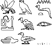 到了纪元前5000~4000年左右,有了埃及文字,其象形文字也有取材于自然形态,与汉字一样是用来表示物体的绘画,及表达思想的记号,也是表现声音的符号(其写法能表现发音的方法),这种符号後来被视为声音符号的起源。埃及象形文字较中国古老的象形文字,更来得具像(如图2)。在纪元前1500~1000年左右,地中海东岸勃起的腓尼基人,因与埃及人有过交易,饱学的僧侣们于是把简单的象形文字,改写成有秩序的字母,其对商业交易,帮助很大。