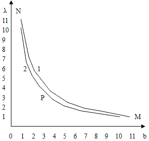 图1为函数λ=B/b曲线,又称码长曲线,这是一反比曲线,曲线1对应GB2312—80字符集,曲线2对应GB13000.1字符集,将自变量b定义域(1、B)代入拉格朗日中值定理λ(B)-λ(1)=λ'(b)(B-1),可求出码长曲线中值点P(b,λ)值为